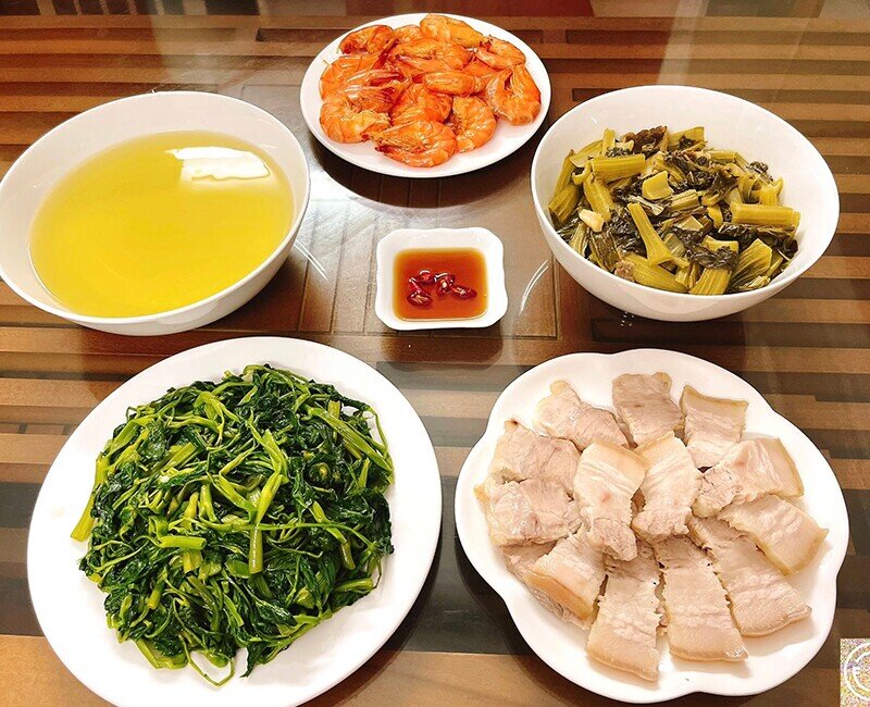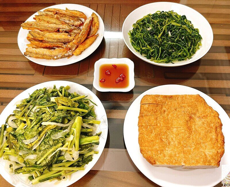 Mâm cơm này gồm các món: Thịt ba chỉ luộc, đậu rán, măng giang luộc, chả viên chiên, dưa cải muối, rau bí xào tỏi. (Ảnh: Thu Hằng)