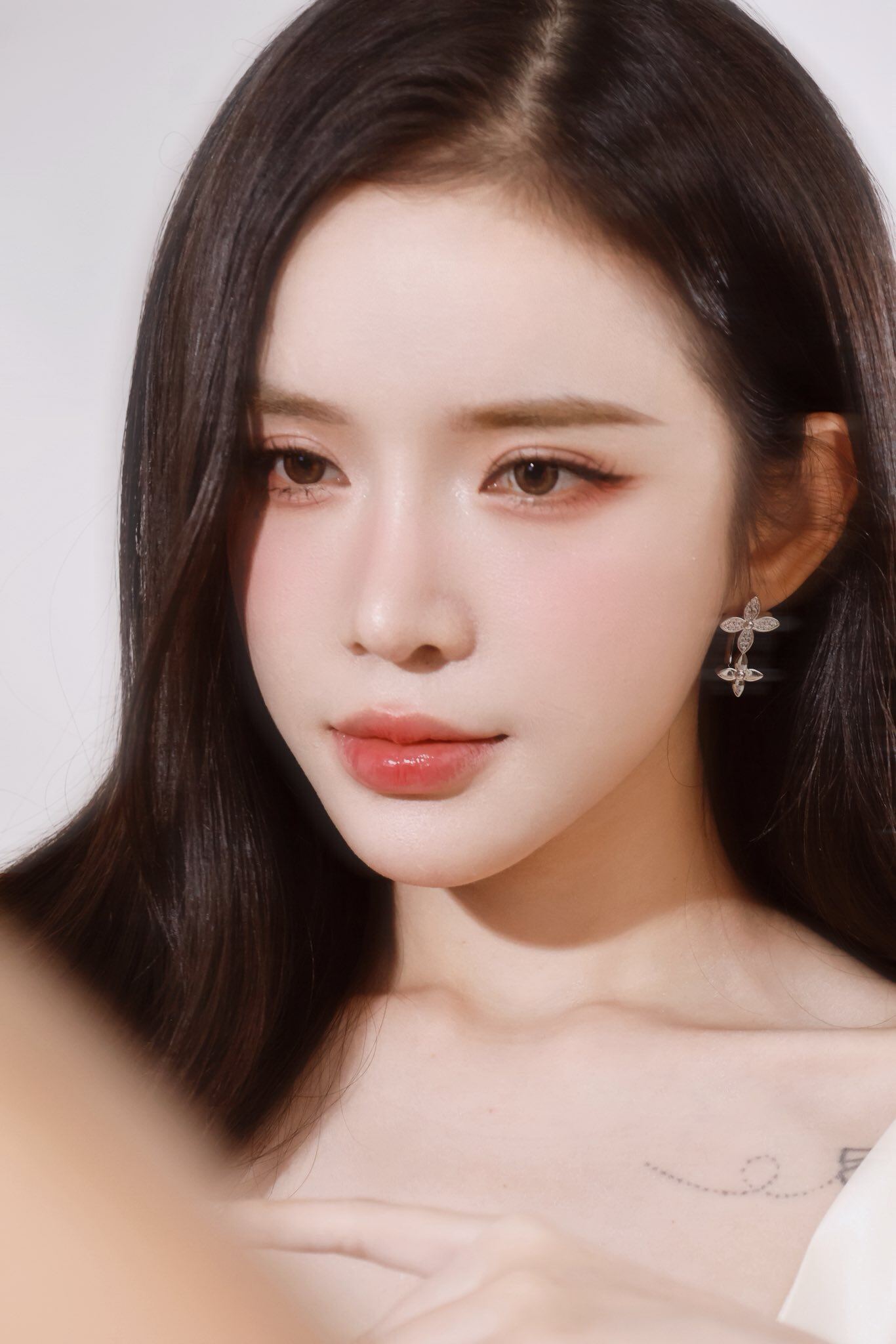 Nữ ca sĩ chuộng lối trang điểm tự nhiên theo phong cách Hàn Quốc, sử dụng tông màu cam đào, hồng phớt nhẹ nhàng càng tôn lên gương mặt thanh tú và nét đẹp trong veo.