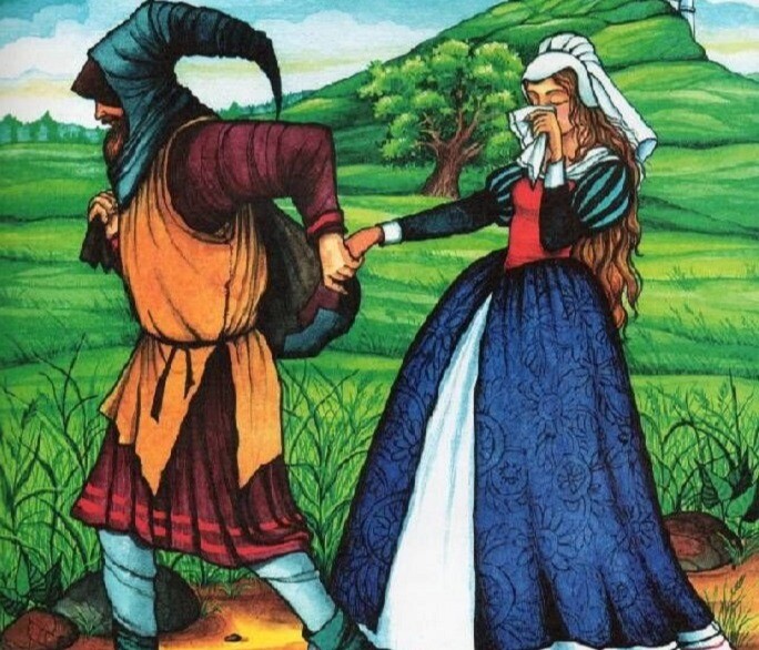 Người ăn mày bèn cầm tay công chúa dắt đi. Cô nàng phải đi bộ. Khi đi đến một khu rừng rộng, nàng hỏi: