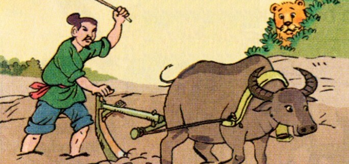 Cọp đợi đến buổi mở cày, Trâu được ra nghỉ ngơi gặm cỏ, còn anh nông dân lên bờ ăn cơm mới mon men lại gần hỏi: