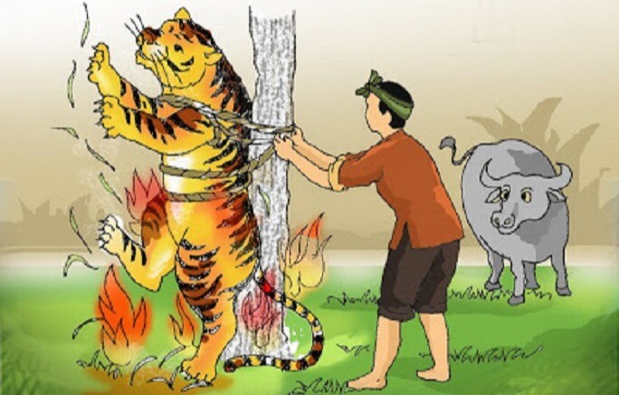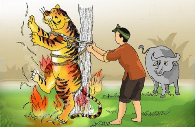 – Nói thật tôi vẫn thấy không an tâm được. Hay Cọp chịu khó để tôi trói tạm vào gốc cây này, rồi đi về lấy trí khôn. Nhỡ Cọp không giữ lời, ăn thịt mất Trâu của tôi thì tôi lấy gì mà cày ruộng tiếp.