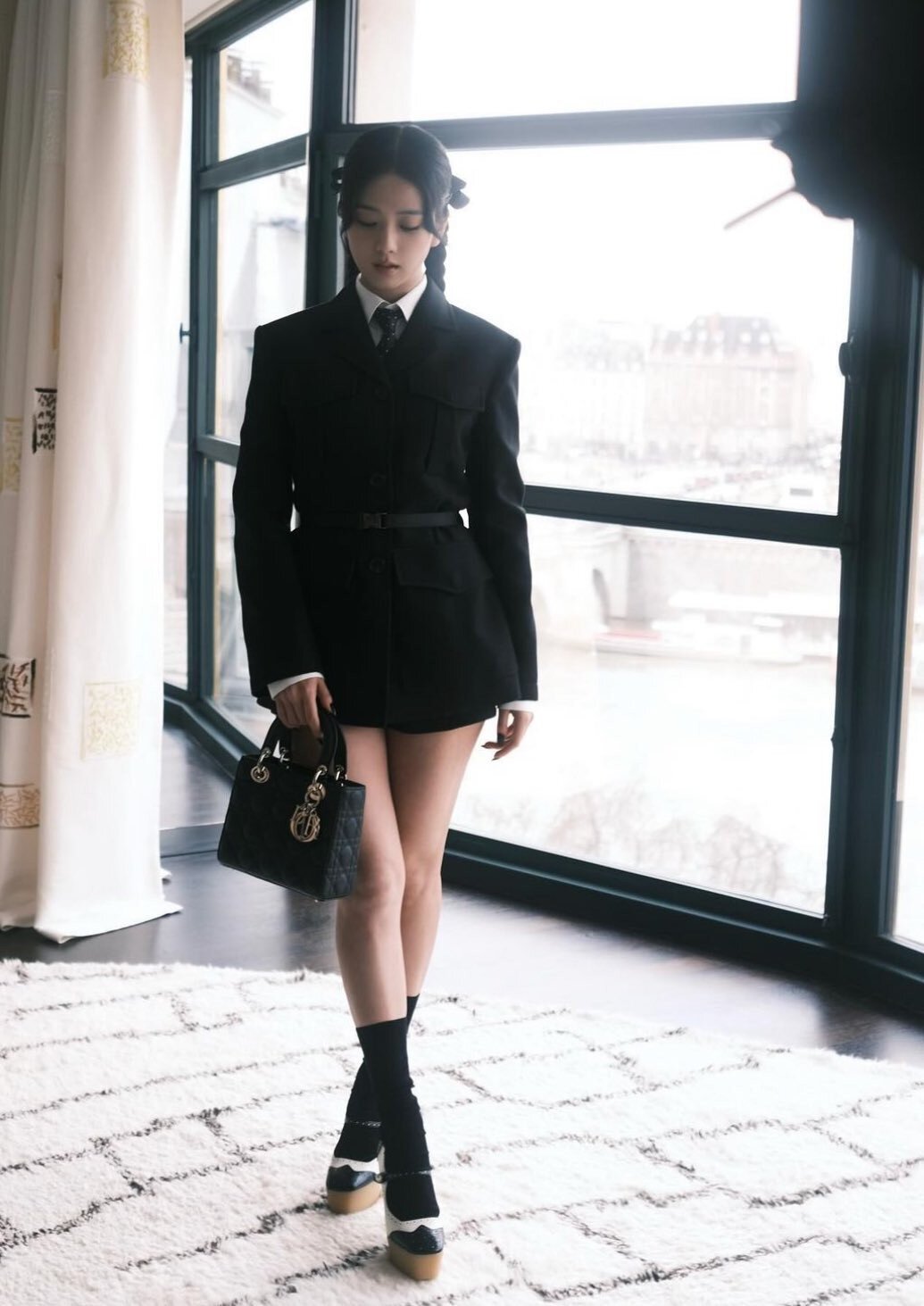 Chân váy ngắn, đặc biệt là kiểu dáng chữ A, giúp làm nổi bật đôi chân và cải thiện tỷ lệ hình thể. Khi kết hợp cùng áo blazer lửng có độ dài ngang hông, tổng thể trang phục trở nên gọn gàng, liền mạch, từ đó tạo hiệu ứng kéo dài chiều cao. Cách phối đồ đồng bộ này của Jisoo không chỉ tôn dáng mà còn mang lại diện mạo thanh lịch, hiện đại, phù hợp với nhiều độ tuổi.