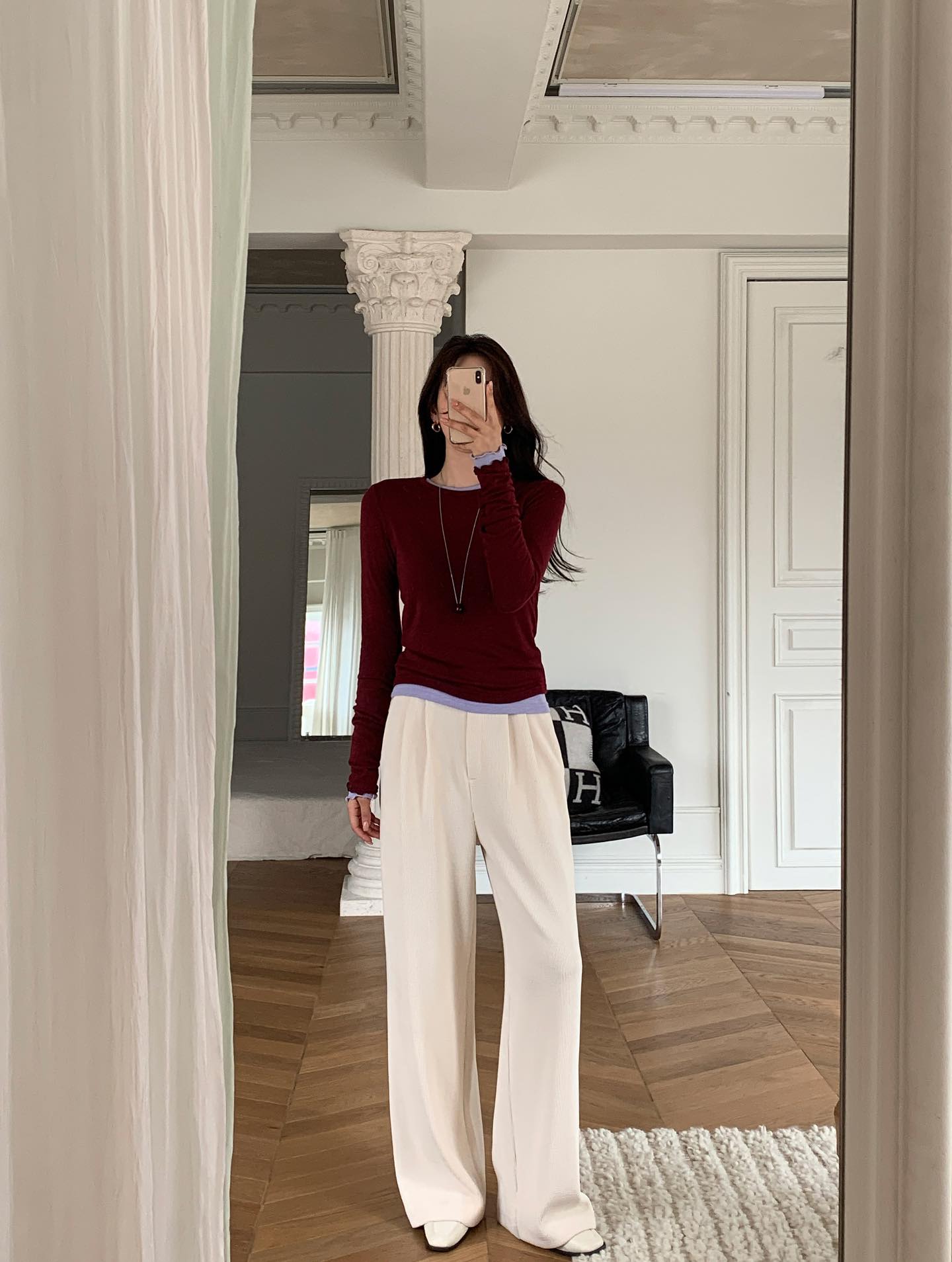 Áo thun dài tay phối cùng quần ống suông là công thức lý tưởng cho những ngày cần sự thoải mái nhưng vẫn phải giữ hình ảnh lịch sự. Áo thun dài tay mang lại cảm giác nhẹ nhàng, dễ mặc, trong khi quần ống suông giúp tổng thể trông gọn gàng và đứng dáng hơn.