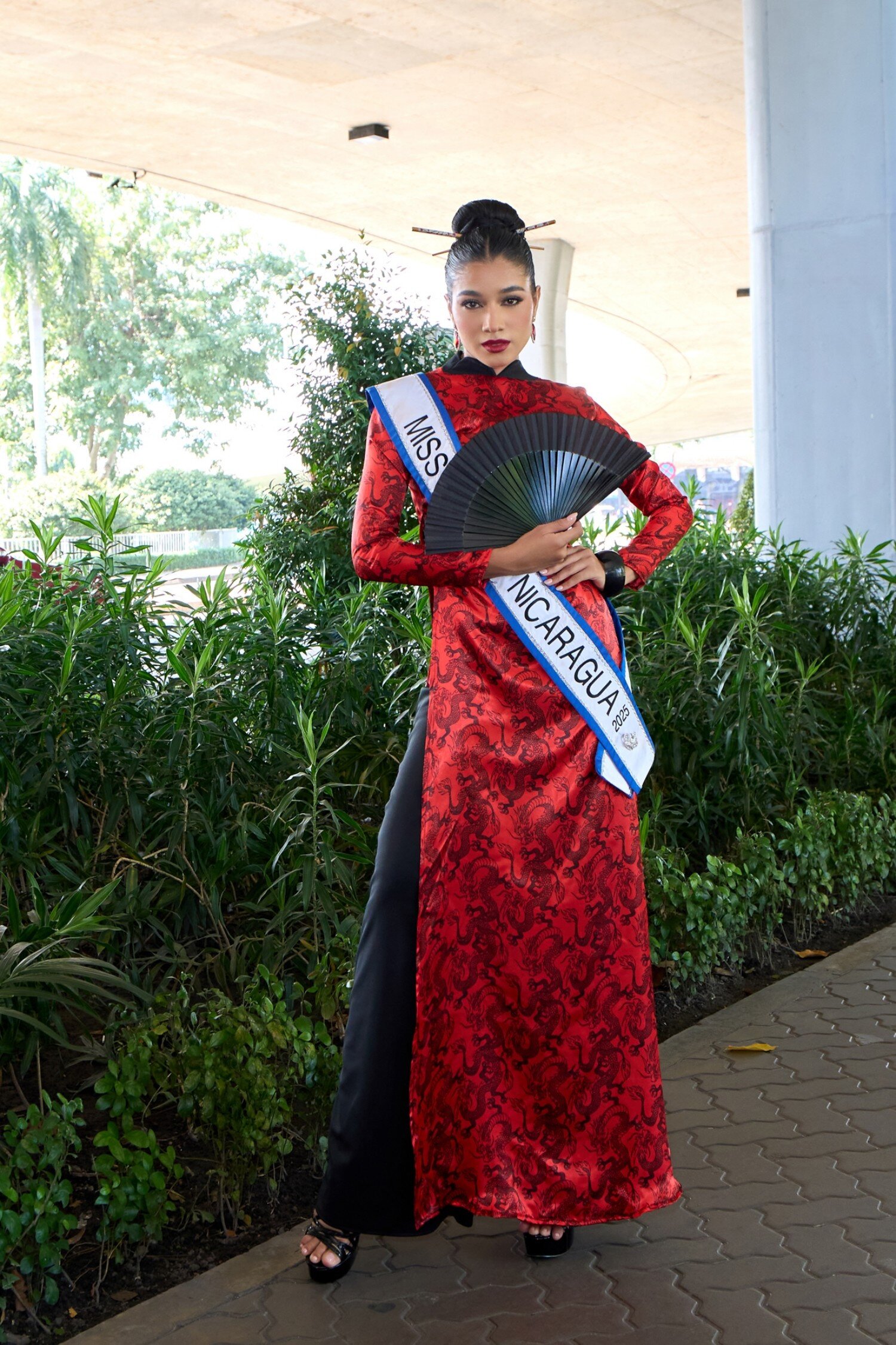 Miss Cosmo Nicaragua 2025 Marian Rodríguez cũng nhận được sự cổ vũ nồng nhiệt khi tự tin catwalk tại sảnh sân bay trong tà áo dài đỏ rực rỡ, kết hợp kiểu tóc búi cao thanh lịch.