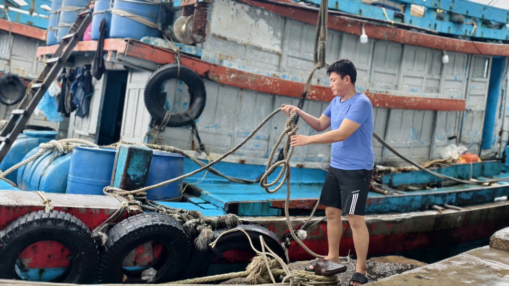 Ở cảng cá Tịnh Kỳ, các tàu cá đã neo đậu cố định trước thời điểm bão đổ bộ. Để chắc chắn, các ngư dân tiếp tục chằng buộc tàu thuyền trước khi rời đi.