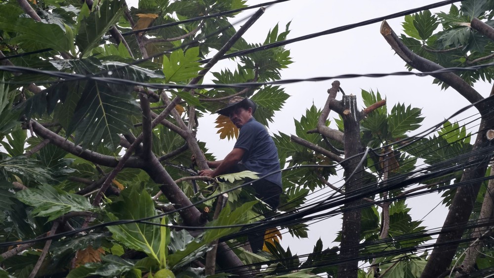 Người dân cắt tỉa cây lớn có nguy có đổ ngã khi gặp gió bão. Ảnh: NGUYỄN YÊN