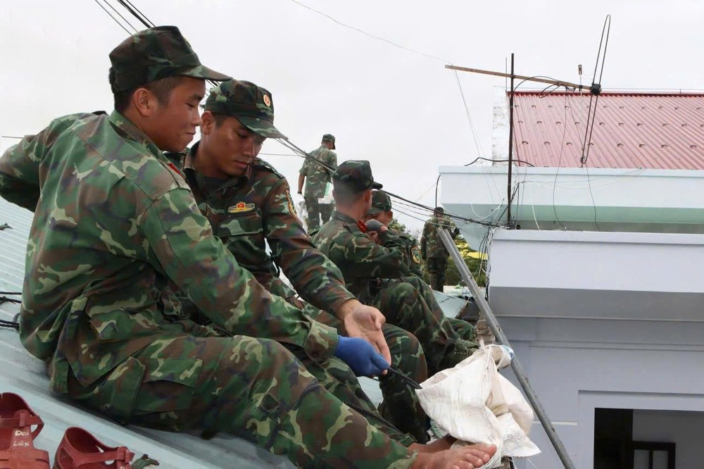 Bộ đội hỗ trợ người dân chằng chống nhà cửa. Ảnh: TẤN VIỆT