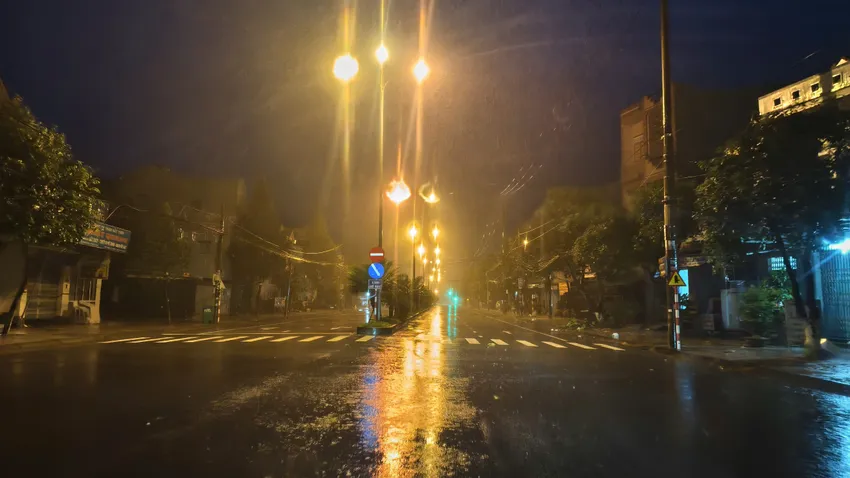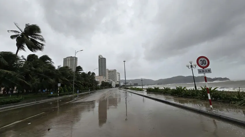 Đến 14 giờ 30 ngày 6-11, Quy Nhơn mưa lớn, gió giật mạnh. Đường phố ngập nước, vắng người qua lại.