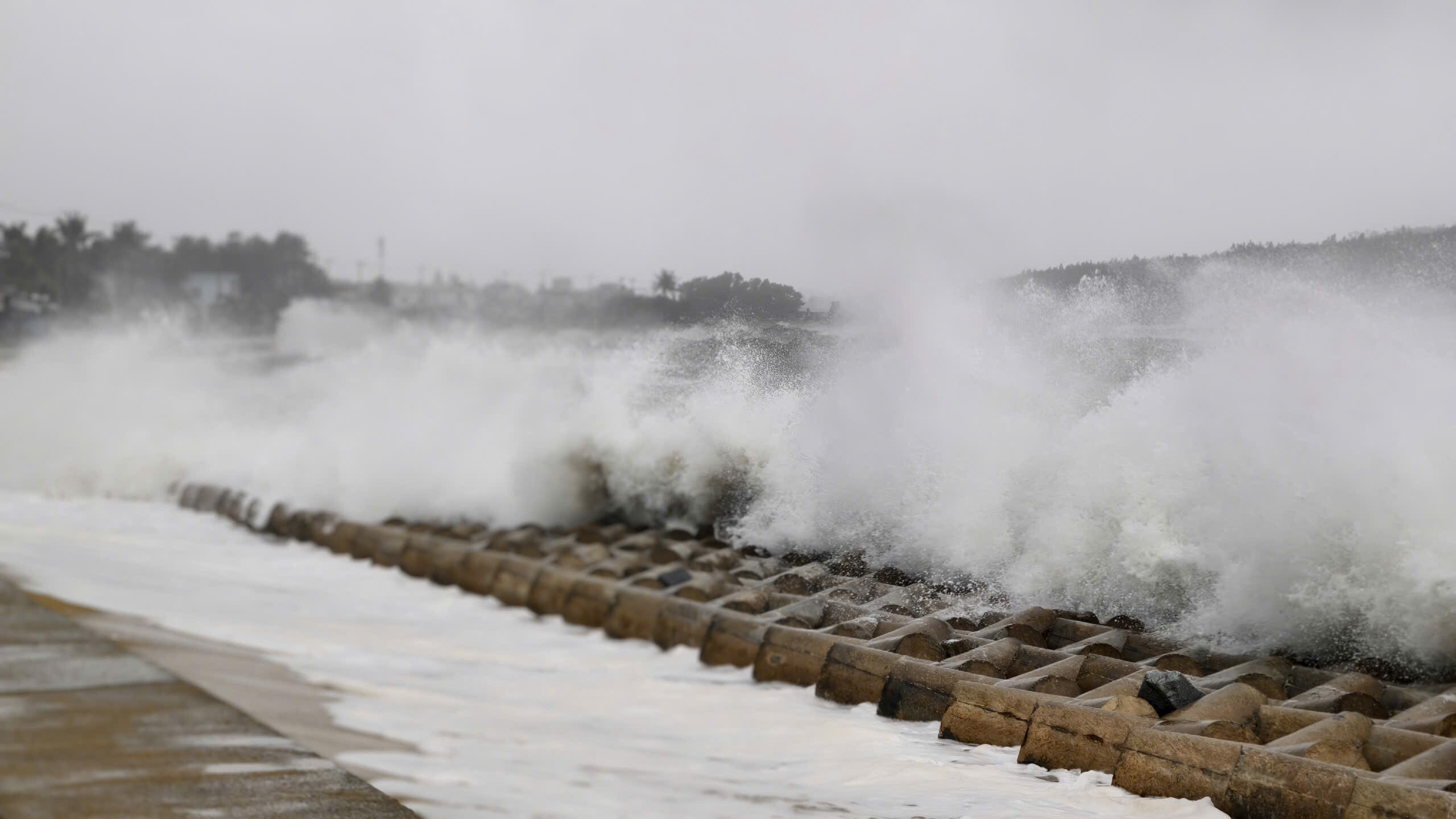 Nhiều đợt sóng ập vào bờ kè với cường độ mạnh.