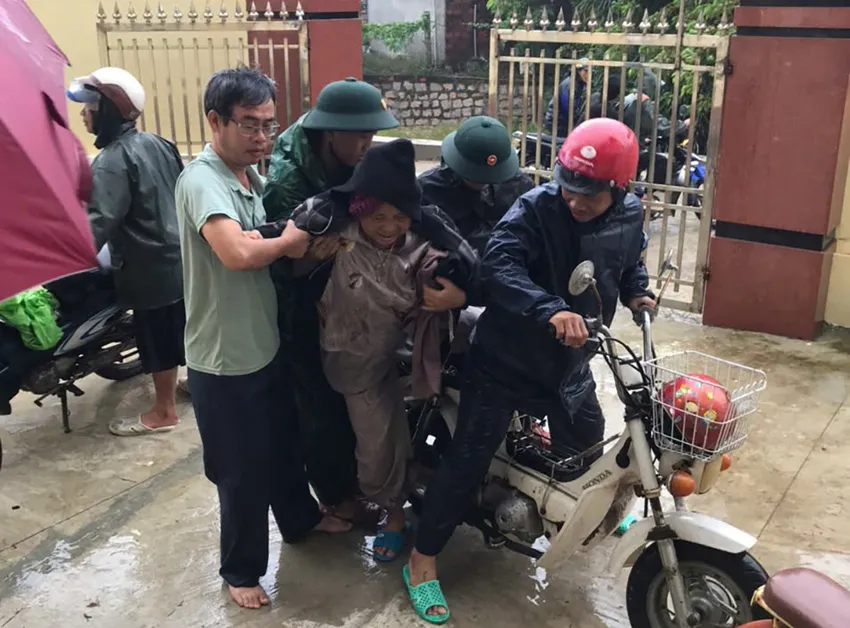 Người già được ưu tiên hỗ trợ di chuyển đến nơi an toàn để tránh bão. Ảnh: LK
