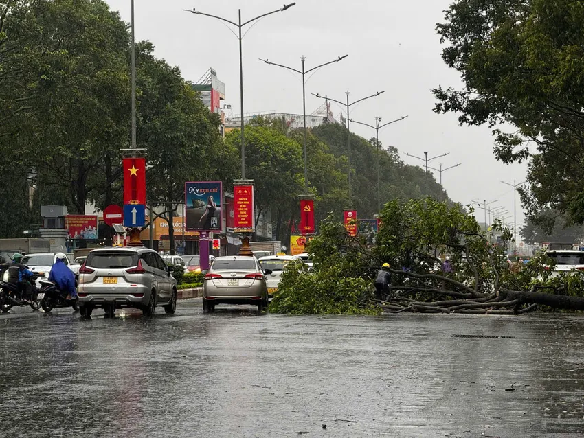 Ngay trong đêm 6-11 và rạng sáng 7-11, lực lượng chức năng, tiến hành kiểm tra, cắt tỉa cây, bảo đảm an toàn giao thông. Ảnh: TIẾN THOẠI