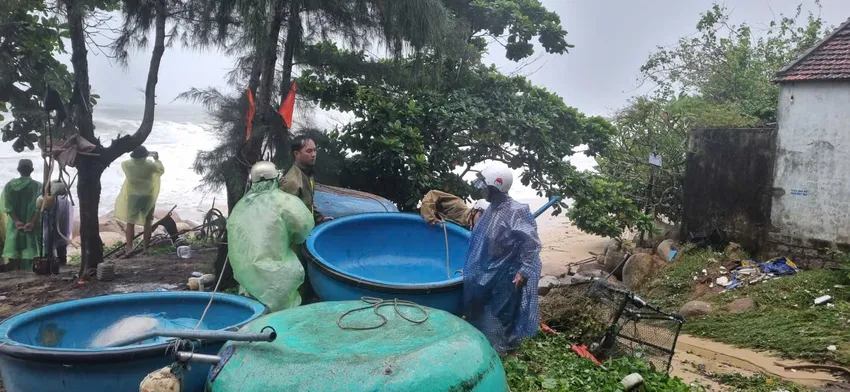 Tại xưởng sửa chữa tàu Trường Đà cuối hạ lưu sông Thu Bồn, giáp với biển, gần 100 cán bộ, chiến sĩ khẩn trương gia cố, bảo vệ hàng chục tàu cá của ngư dân đang trong thời gian bảo dưỡng.